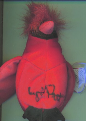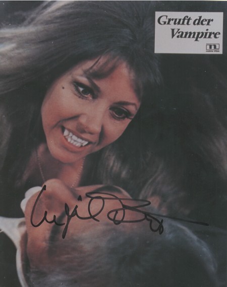 Ingrid, real name Ingoushka Petrov, is best known for her roles as a vamp in the Hammer Horror movies of the 70's. She has kindly signed Mac, funnily enough who is "blood red"